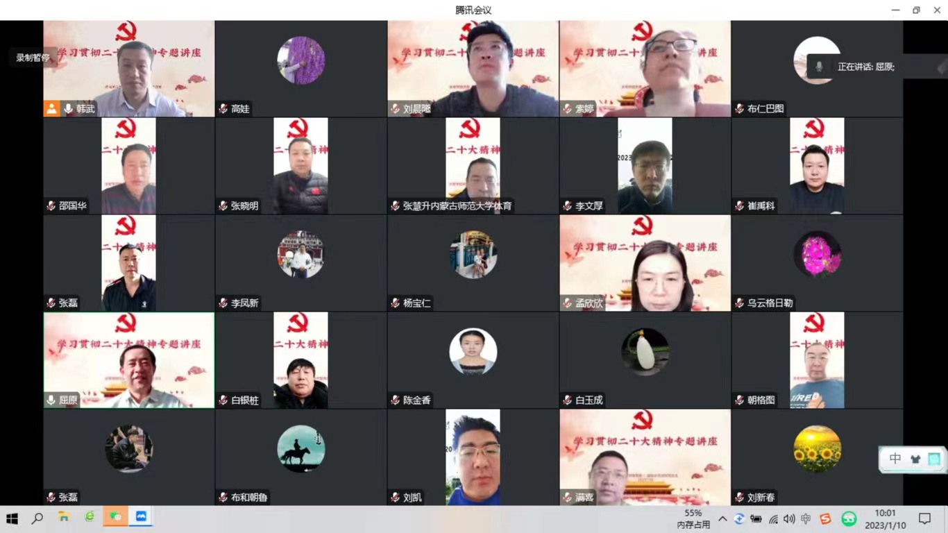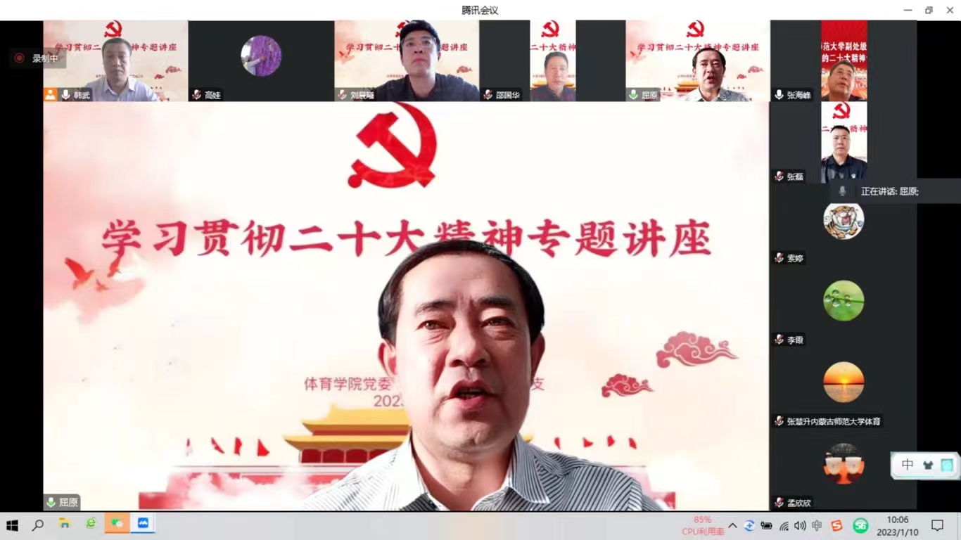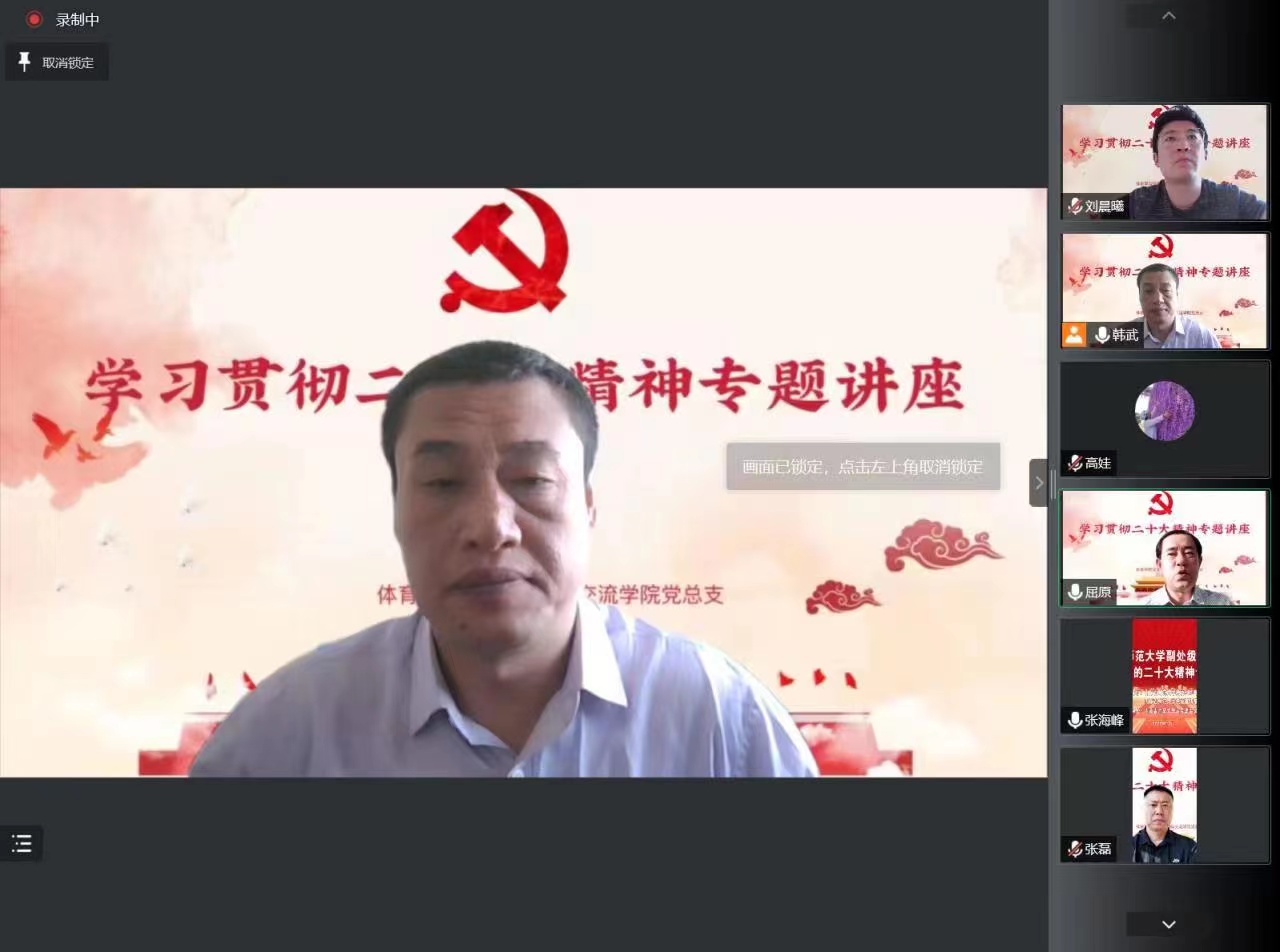 2023年1月10日上午,我校党委副书记张海峰为体育学院和国际交流学院作贯彻党的二十大精神专题讲座。参加讲座的有体育学院、国际交流学院各党支部书记及环节干部,讲座由体育学院党委书记韩武主持。