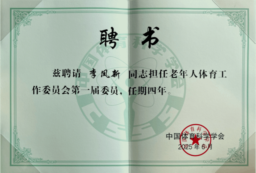安博官方网站副院长(主持工作)李凤新教授受聘为中国体育科学学会老年人体育工作委员会委员,任期四年。