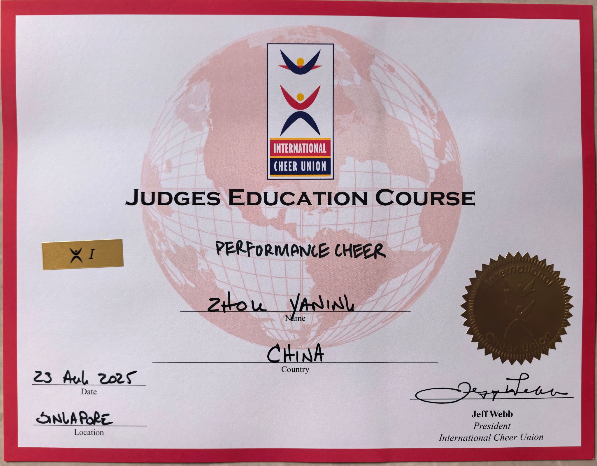周雅宁老师长期致力于健美操、健身操、民族健身操、啦啦操等教学与裁判工作,此次获认证不仅是其个人职业生涯的重要里程碑,更标志着内蒙古啦啦操裁判水平首次获得国际权威认可。她的成功,为内蒙古师范大学体育学科发展注入新动力,也为中国北疆地区啦啦操运动的国际化推广奠定坚实基础。